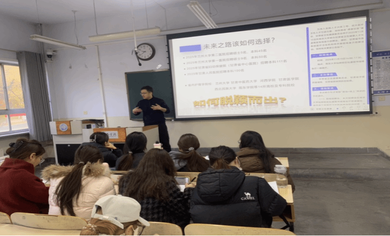 报告会上,两位优秀员工分享各自在母校培养下的成长经历与奋斗历程。郑军结合当前医疗体制改革、医护人员招聘等,对同学们开展职业规划、素质拓展、就业招聘等给予了指导;豆宝珍结合自身的创业感悟、国家产业调整、众多赴疆就业毕业生的成功案例及大美新疆的美好前景,热切鼓励同学们踊跃赴疆就业