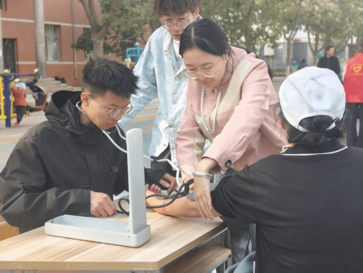 二是有序实施,志愿服务与心灵成长并行。活动在校园家属楼幼儿园前广场人流较为集中的区域设置义诊服务点。现场,同学们分为若干小组,轮流通岗。他们以严谨专业的态度,为前来咨询的师生、教职工及家属提供免费的血压测量服务,并耐心讲解高血压的防治知识、普及健康生活方式。
