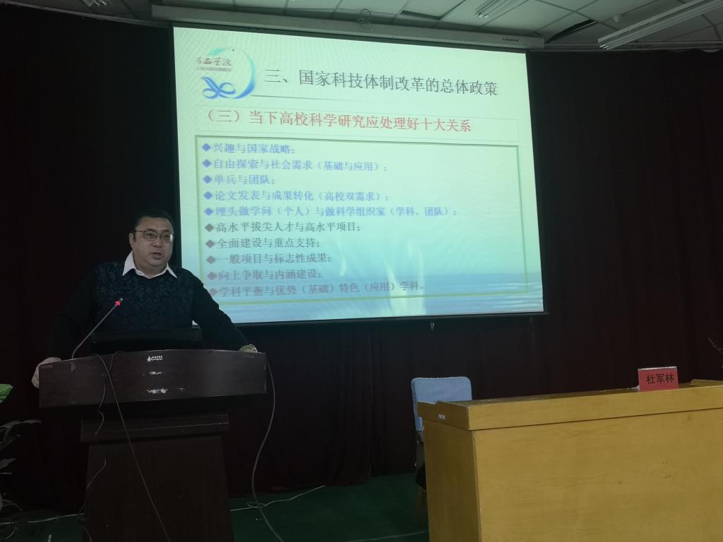 12月3日下午,yl6809永利特邀科技处副处长杜军林教授为师生作了题为“教研和项目申报工作的几点经验与体会”的学术报告。yl6809永利300余名师生聆听了报告,党委委员、教科办主任杨淑珍主持报告会。